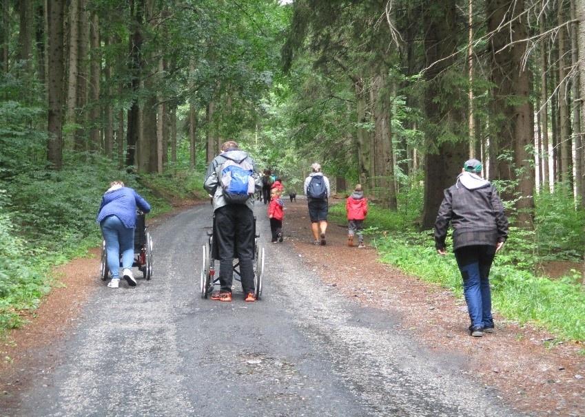 Na cestě se občas objevily lavičky a stolečky ve tvaru hub, které jsme rádi využili. Posilnili jsme se svačinou a pitím a občas i za zpěvu jsme se šplhali směrem k vrcholu. Čím víc jsme se blížili k cíli, tím více všichni zpomalovali, až na některé výjimky jako např. pan L. Ten by kopec nejraději vyběhl tam a zpět a opravdu nachodil nejvíce kilometrů, protože jako správný gentleman nenechal ženy samotné, ale vždy se vrátil a podpořil pomalejší chodce. Všechny nás také překvapila paní R., která s chutí tlačila před sebou vozík, usmívala se a rozmlouvala po cestě s kolemjdoucími. Šli jsme svým tempem, ať je nám cesta příjemná. Nahoře u lesního baru jsme odpočívali a koupili si vynikající trubičky a od provozovatelky lesního baru jsme dostali pohlednice. Občerstvení se platilo do kasičky, která je pověšená na stromě.