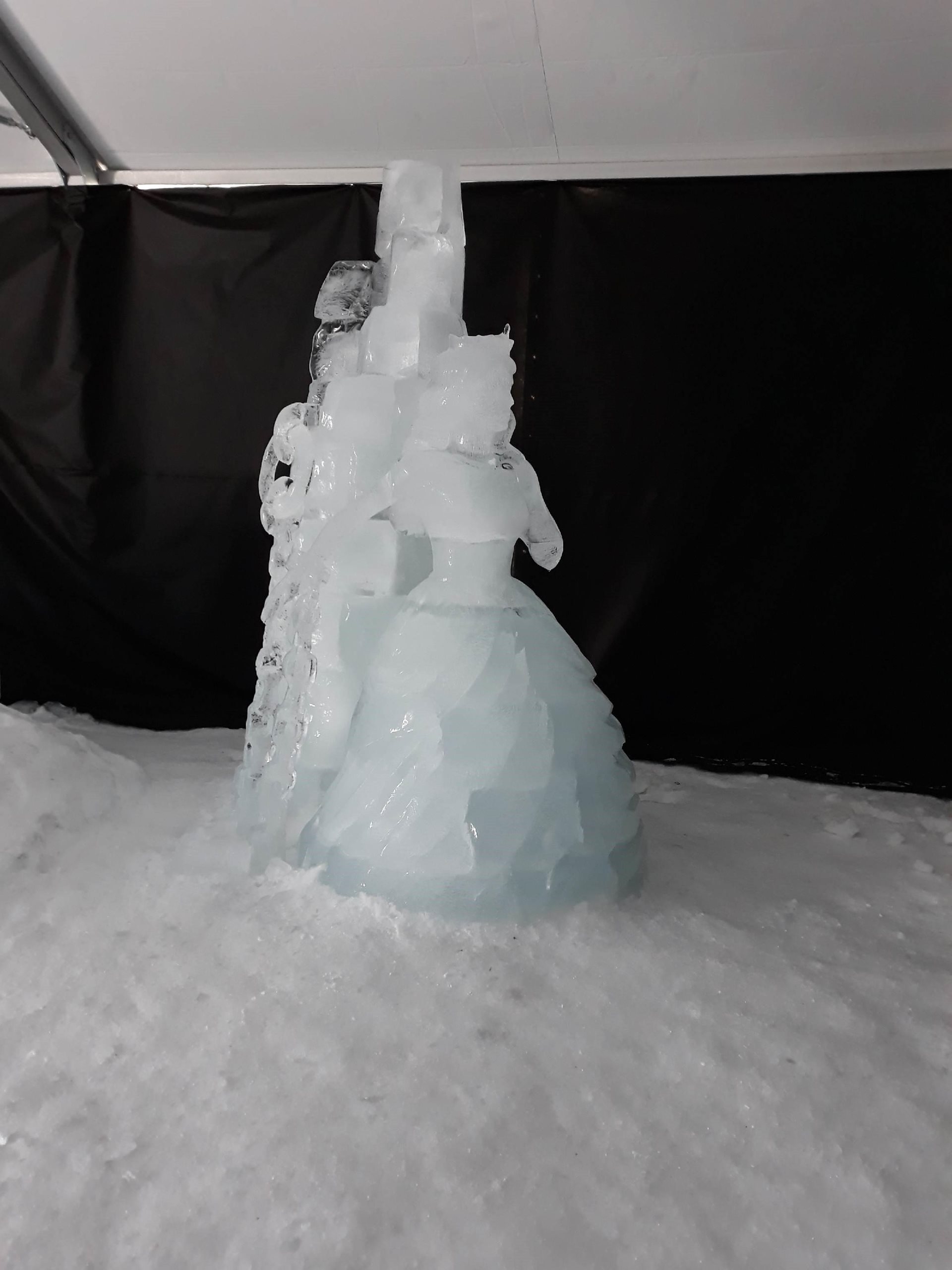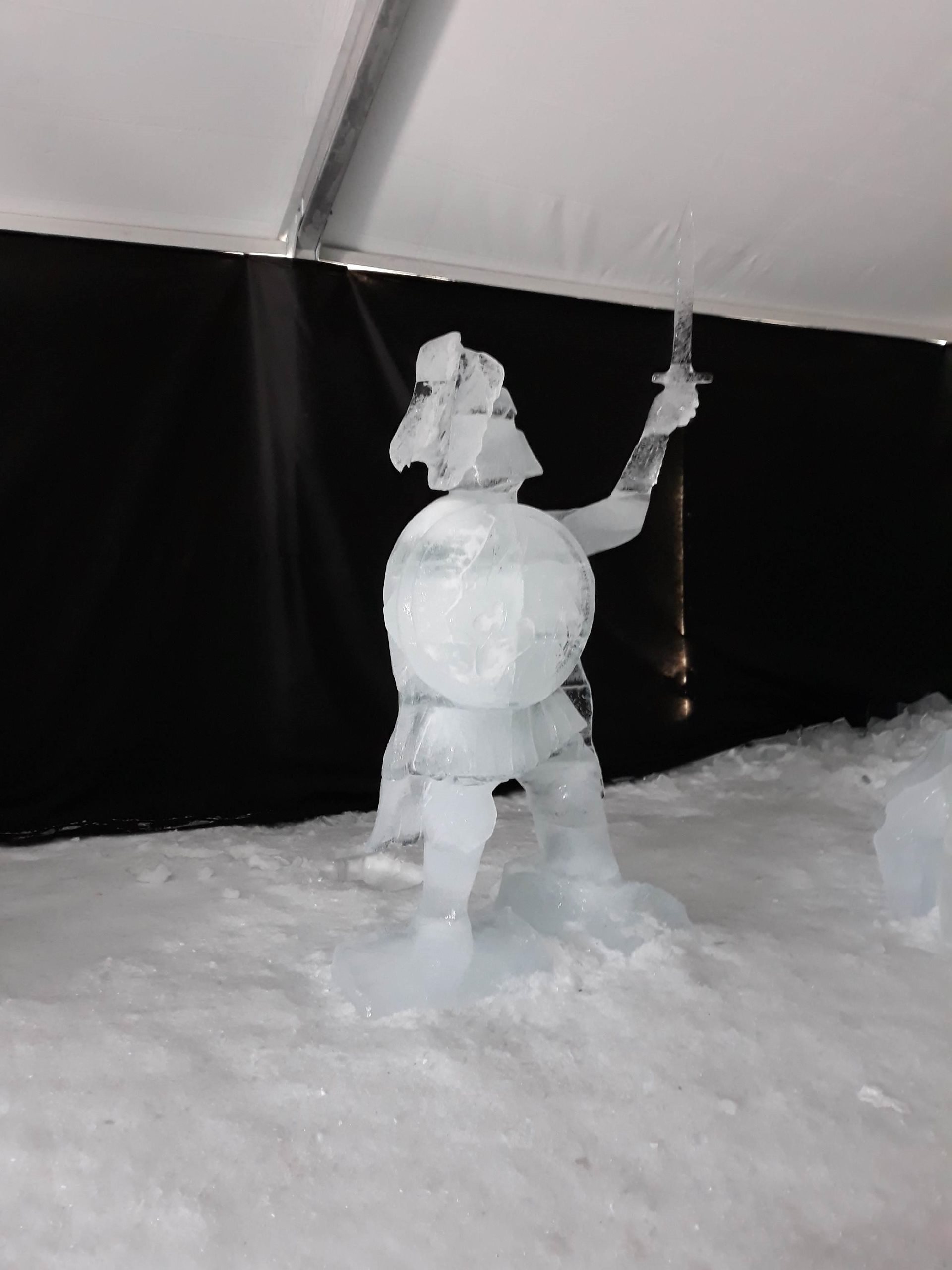 Nejdříve jsme ledové sochy neviděli, ale po bližším prozkoumání okolí Pusteven byly objeveny ve velkém stanu. Tady se všichni chtěli fotit, muži s rytířem a drakem. Ženy chtěly mít na fotce velký ledový hrad.