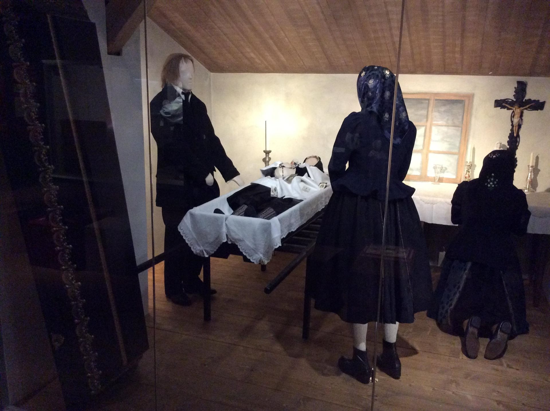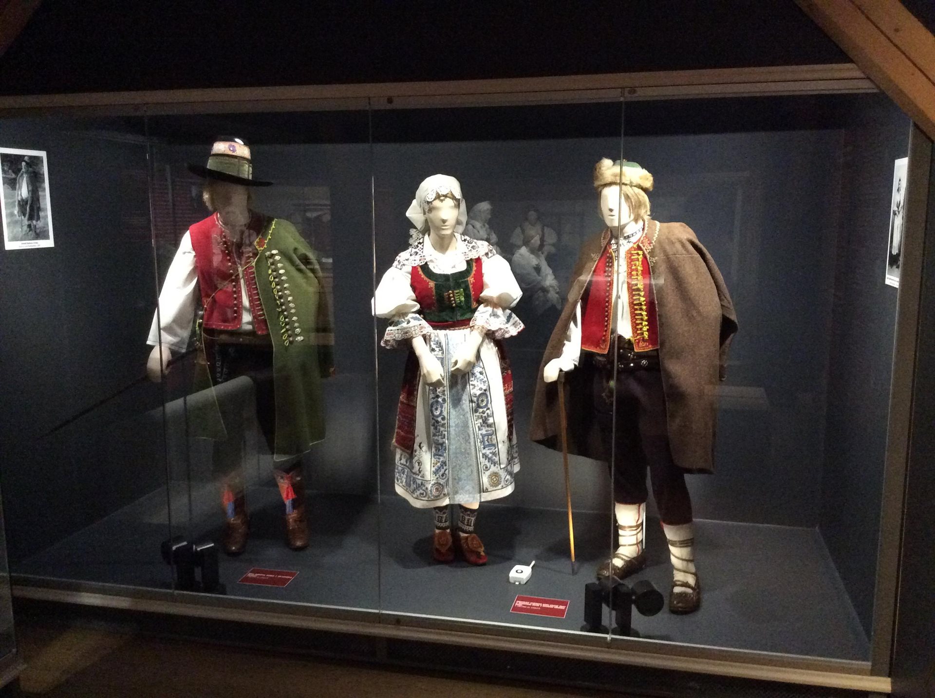 V druhé části podkroví byla výstava s názvem „ Od stroje ke kroji“ (nebo možná obráceně), každopádně se nám všem moc líbila. V příjemném přítmí byly vystaveny sváteční kroje Valašska, od spodniček, přes klobouky a boty až ke kabátům. Možnost zhlédnutí krátkého filmu o postupném oblékání krojů u mužů i žen bylo zajímavou třešničkou na dortu. Tady jsme se zasekli opravdu dlouho, ale nedalo se odolat.