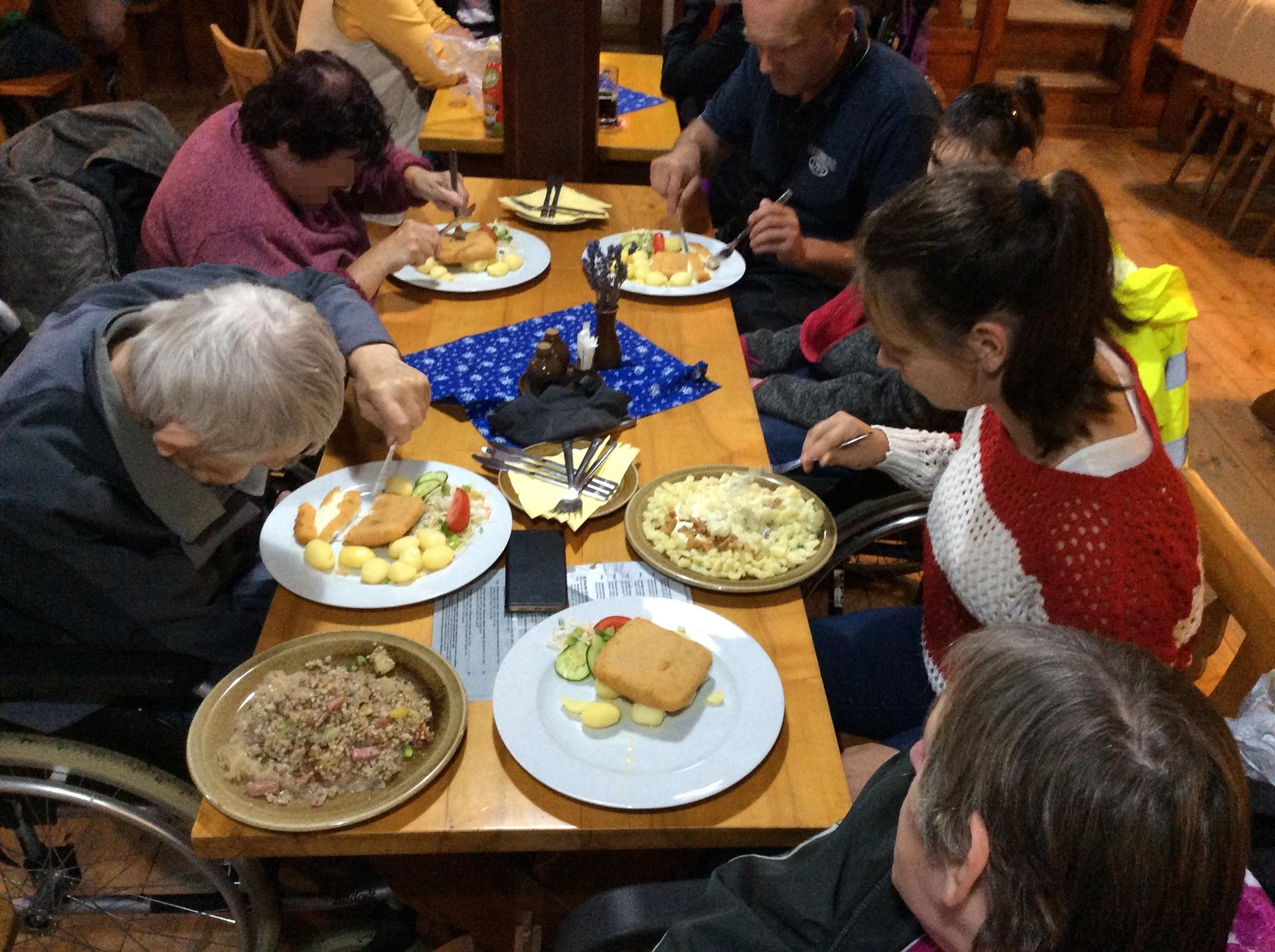 Do samotného městečka jsme se dostali až po druhé hodině. Letmá prohlídka dřevěných budov v dešti a hurá do hospůdky. Bříška už se ozývala, ale hlavně to tam parádně vonělo. Nejdřív jsme naměstnali 6 vozíků kolem stolů (fuška fakt!), a pak už rychle objednávat. Tentokrát skoro u všech vyhrál pořádný smažák s maštěnými brambory, naši nejmenší si cpali bříška jahelnou kaší na sladko a doprovod se ládoval bramboráky.