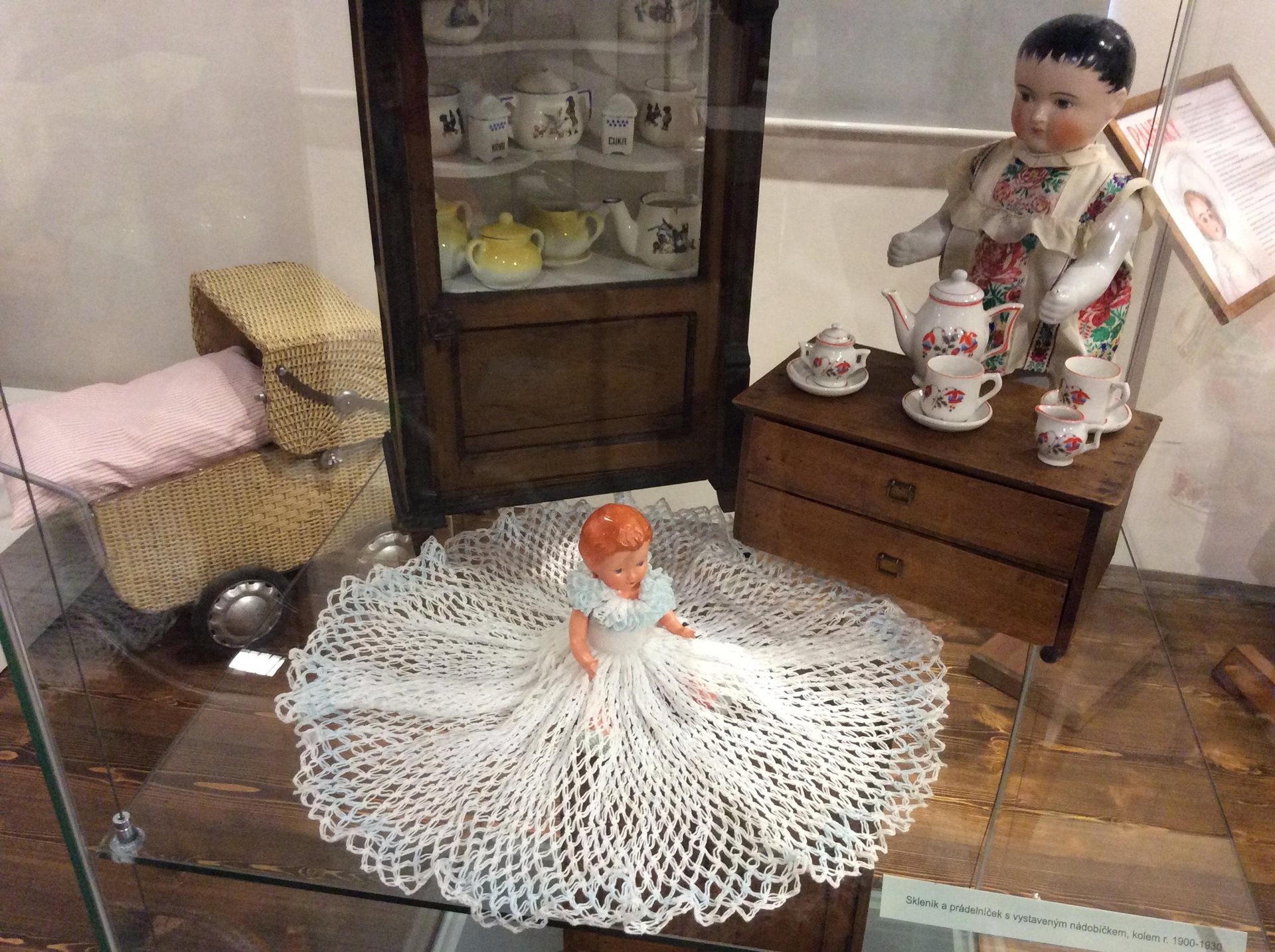 Další částí výletu byla plánovaná návštěva Dřevěného městečka. Při vstupu do areálu jsme si všimli, že je v hlavní budově nad pokladnami výstava krojů. A protože je budova vybavena výtahem, neváhali jsme ani chvilku a vyjeli do patra. V jedné části na nás čekala výstava hraček od dob našich praprababiček až po hračky, se kterým jsme si hráli i my. Trocha nostalgie, ale hlavně rozčarování nad tím, že už i naše hračky patří mezi muzejní kousky... To to letí.