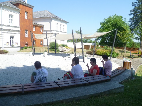 Poté jsme zamířily do zahrady u Národní školy, kde se nám naskytla možnost posezení. Také se nám odtud otevřel překrásný výhled na Slezskou kalvárii o okolní přírodu. V zahradě jsou umístěny lavičky určené k relaxaci, kterých jsme samozřejmě rády využily. V zahradě je umístěn menší amfiteátr, ve kterém se pořádají různá letní představení. Klidné a krásné prostředí této zahrady jsme využily k odpočinku a občerstvení, a také k pořízení několika fotografií na památku.