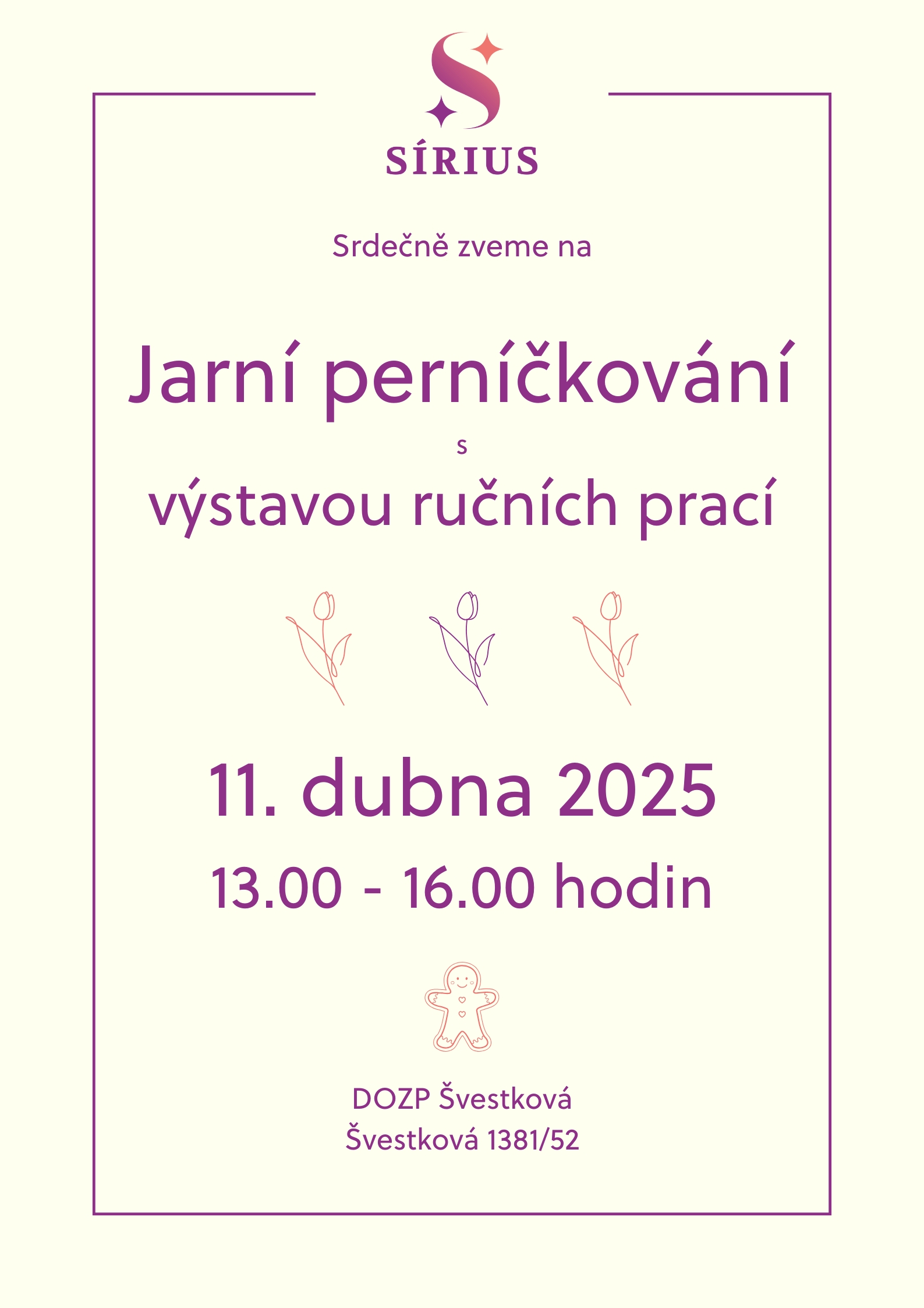 Přijďte si užít jarní atmosféru, ozdobit perníčky a obdivovat krásné ruční práce. Těšíme se na Vás!