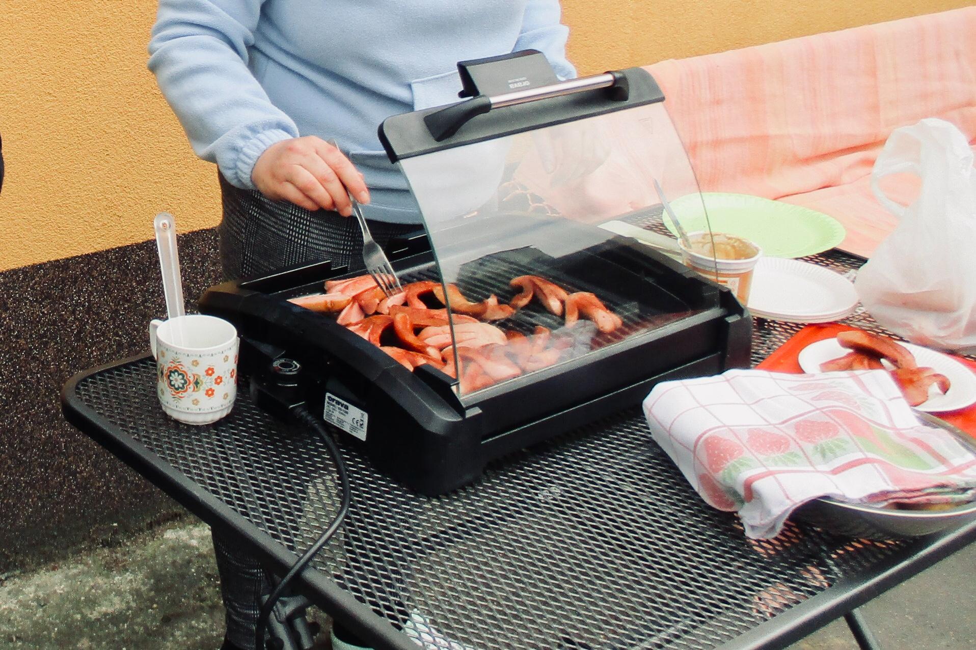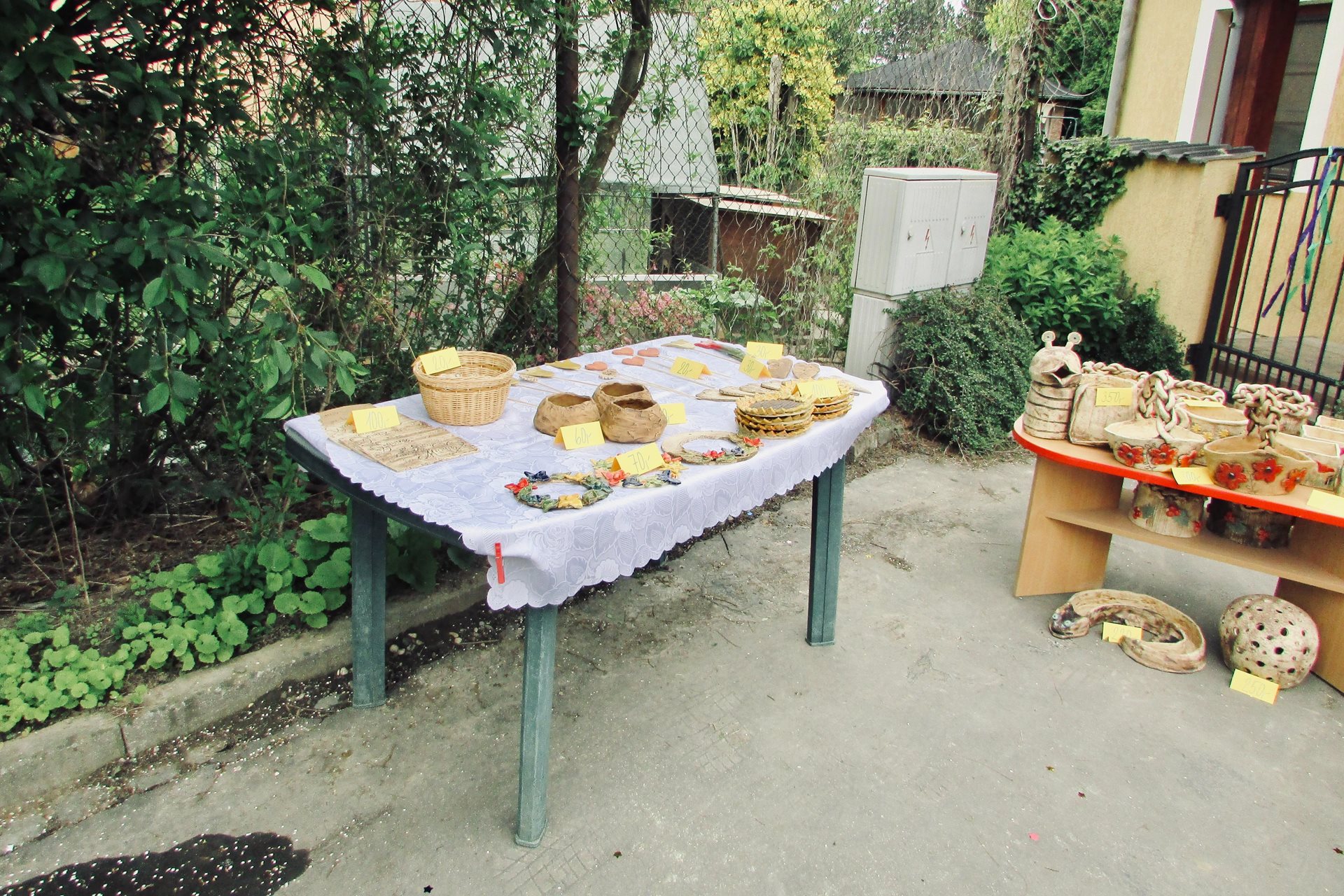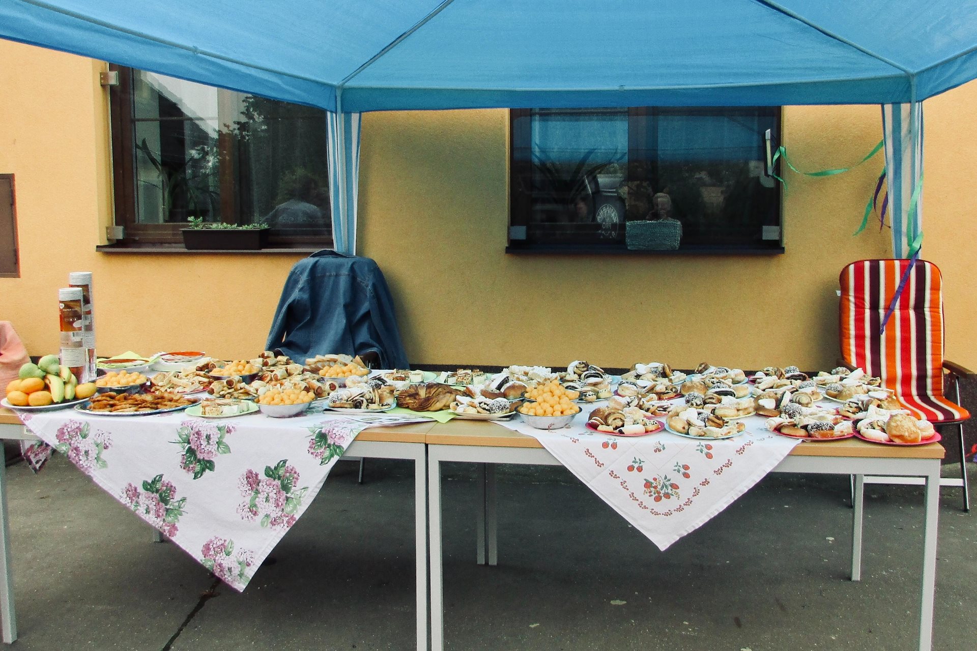 Náhle se z ničeho nic objevil vůz s nákladem občerstvení. Každý se ujal různého úkolu – jeden převzal velení a srdečně přivítal dobrodince, který ochotně pomáhal vybalovat zásoby a zajímal se o průběh příprav, druhý přinesl špekáčky a třetí se postaral o hudbu a přípravu výrobků z keramiky k možnosti zakoupení či jen prohlédnutí, co uživatelé služeb tvoří. Po obědě jsme připravili bohatý raut, do kterého kolegyně ze služby přidaly koláče, řízky, sladkosti a slané pečivo.