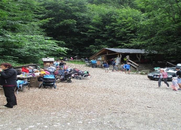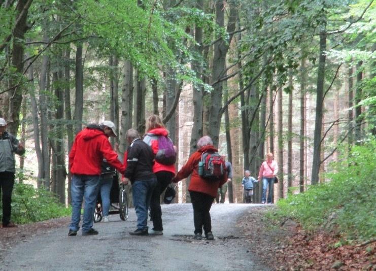 Na cestě se občas objevily lavičky a stolečky ve tvaru hub, které jsme rádi využili. Posilnili jsme se svačinou a pitím a občas i za zpěvu jsme se šplhali směrem k vrcholu. Čím víc jsme se blížili k cíli, tím více všichni zpomalovali, až na některé výjimky jako např. pan L. Ten by kopec nejraději vyběhl tam a zpět a opravdu nachodil nejvíce kilometrů, protože jako správný gentleman nenechal ženy samotné, ale vždy se vrátil a podpořil pomalejší chodce. Všechny nás také překvapila paní R., která s chutí tlačila před sebou vozík, usmívala se a rozmlouvala po cestě s kolemjdoucími. Šli jsme svým tempem, ať je nám cesta příjemná. Nahoře u lesního baru jsme odpočívali a koupili si vynikající trubičky a od provozovatelky lesního baru jsme dostali pohlednice. Občerstvení se platilo do kasičky, která je pověšená na stromě.
