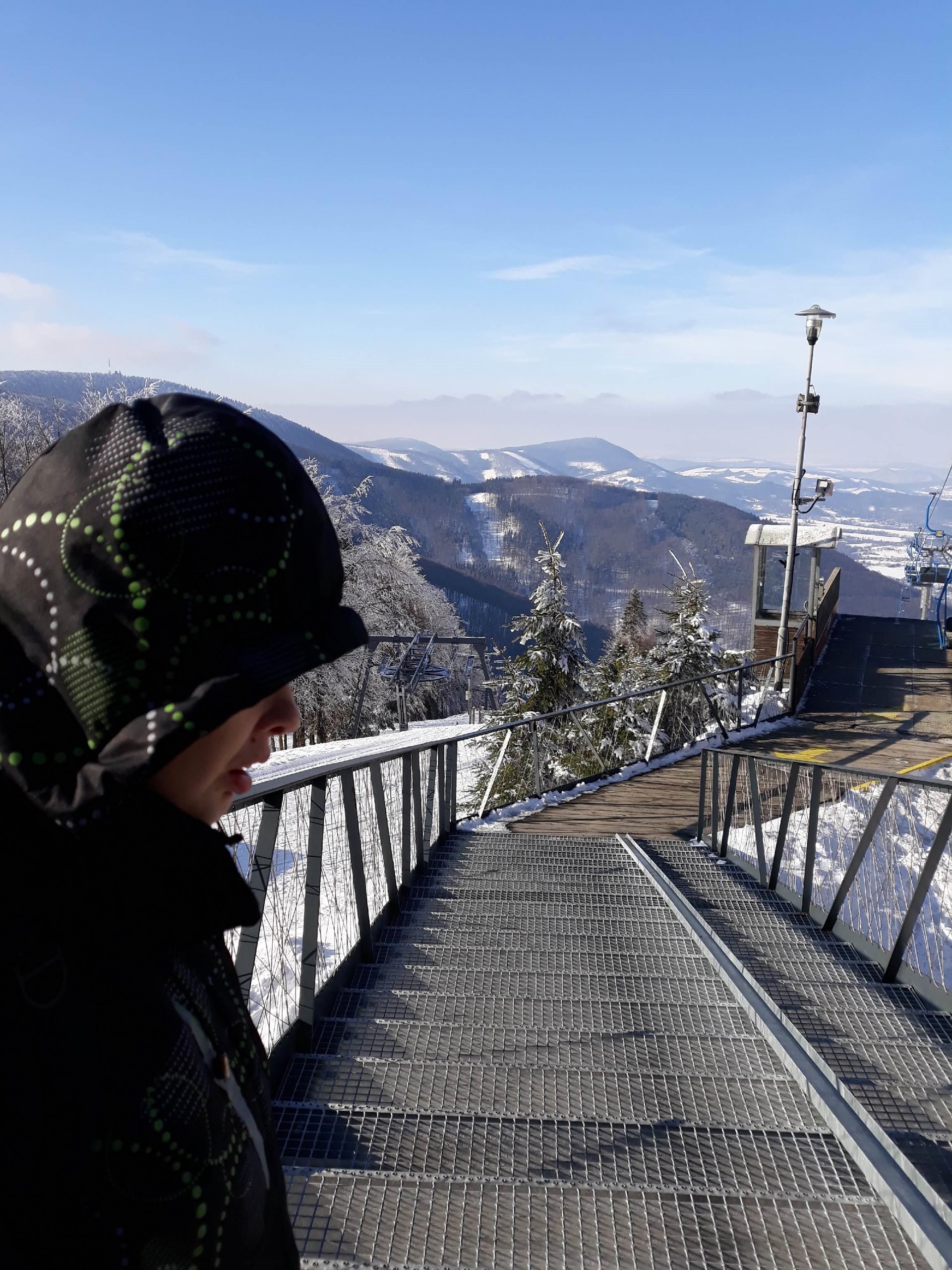 To už, ale výletníkům vyhládlo a ukazatel nám připomínal směr k restauraci. Ta měla hodně velká okna s vyhlídkou na hory a lanovku. Takže volba byla jasná a stoly u oken zůstaly v našem obležení.