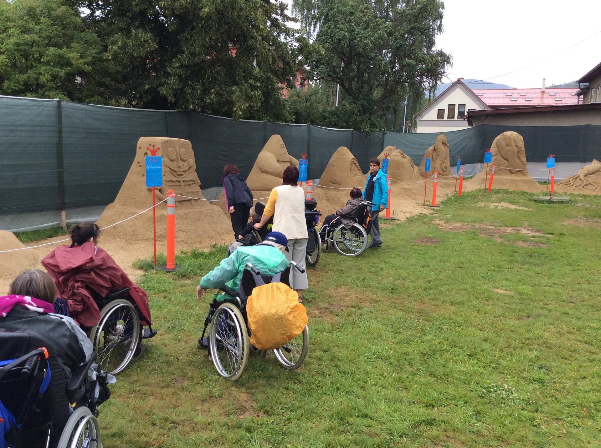 Prohlídku soch provázel náročný travnato – pískový terén. Ten proklínali všichni, co tlačili vozíky, uživatelé spokojeně mokli pod pláštěnkami a mohutně nás povzbuzovali, protože chtěli všechno vidět.