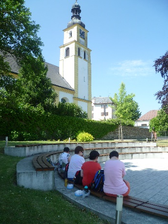 Poté jsme zamířily do zahrady u Národní školy, kde se nám naskytla možnost posezení. Také se nám odtud otevřel překrásný výhled na Slezskou kalvárii o okolní přírodu. V zahradě jsou umístěny lavičky určené k relaxaci, kterých jsme samozřejmě rády využily. V zahradě je umístěn menší amfiteátr, ve kterém se pořádají různá letní představení. Klidné a krásné prostředí této zahrady jsme využily k odpočinku a občerstvení, a také k pořízení několika fotografií na památku.